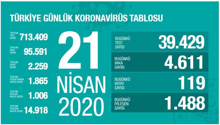 Son dakika haberi... 'Türkiye Günlük Koronavirüs Tablosu'na göre; dün yapılan 39 bin 429 testten 4 bin 611'i pozitif çıktı. 119 kişi hayatını kaybetti, 1488 kişi de iyileşti. Tabloda, toplam test sayısı 713 bin 409, toplam vaka sayısı 95 bin 591, yaşamını yitiren toplam kişi sayısı 2 bin 259, toplam yoğun bakım hasta sayısı 1865, toplam entübe hasta sayısı 1006 ve toplam iyileşen hasta sayısı 14 bin 918 olarak açıklandı.