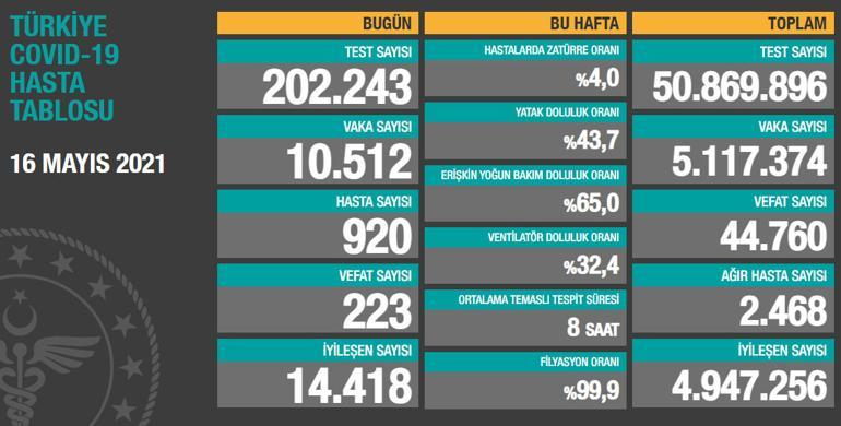 Sağlık Bakanlığı, 16 Mayıs corona virüs tablosunu paylaştı. Tabloya göre, son 24 saatte 202 bin 243 Kovid-19 testi yapıldı, 10 bin 512 kişinin testi pozitif çıktı, 223 kişi hayatını kaybetti. Ağır hasta sayısı 2 bin 468 oldu, 14 bin 418 kişinin Kovid-19 tedavisinin/karantinasının sona ermesiyle iyileşen sayısı 4 milyon 947 bin 256'ya yükseldi.
